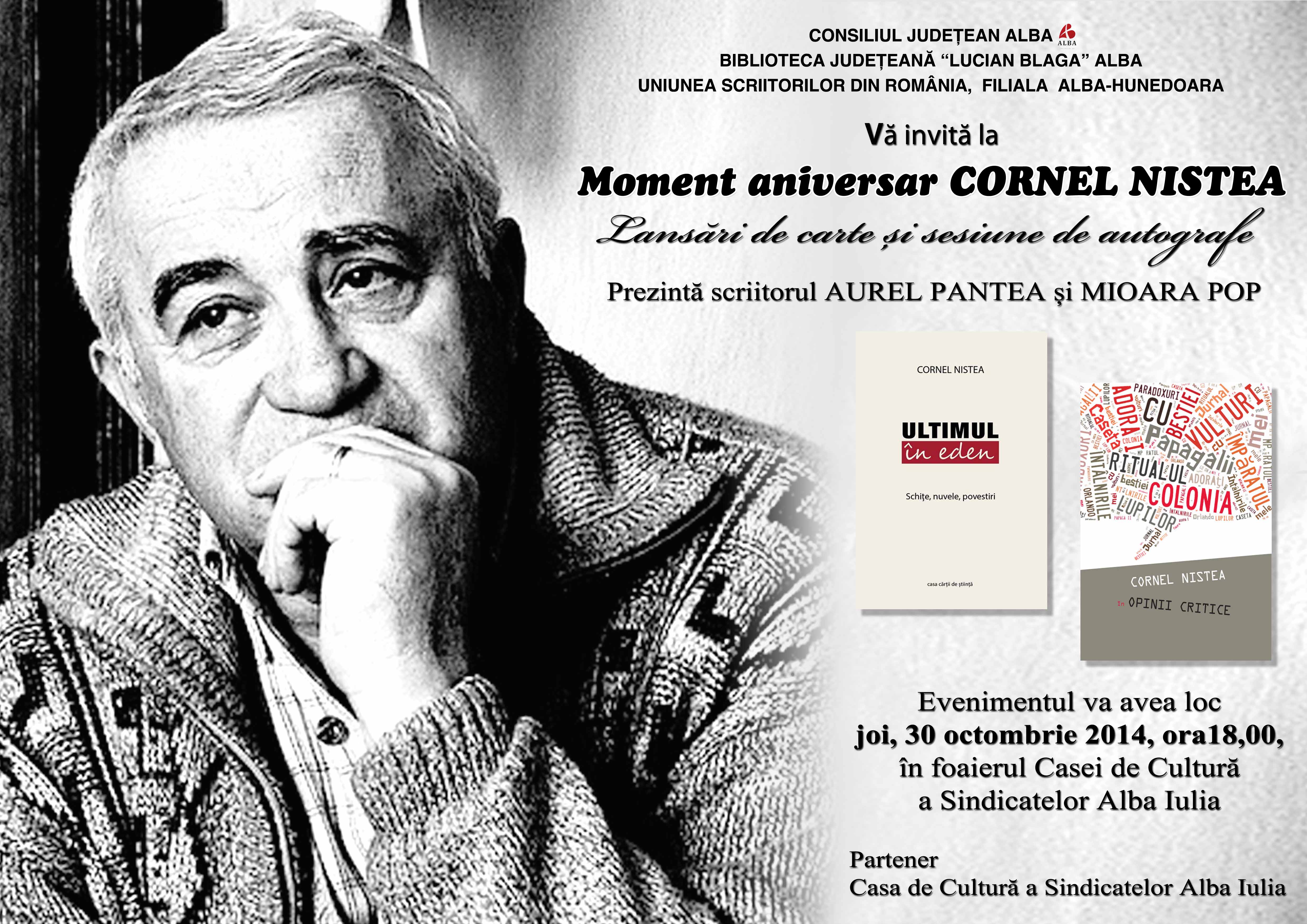 Pe 30 octombrie 2014, la Alba Iulia a avut loc un moment aniversar prilejuit de împlinirea a75 de ani de la naştere a scriitorului Cornel Nistea, ocazie cu care autorul şi-a lansat cartea de proză scurtă „Ultimul în Eden”, dar şi volumul de critică literară dedicat scriitorului „Cornel Nistea în opinii critice”.