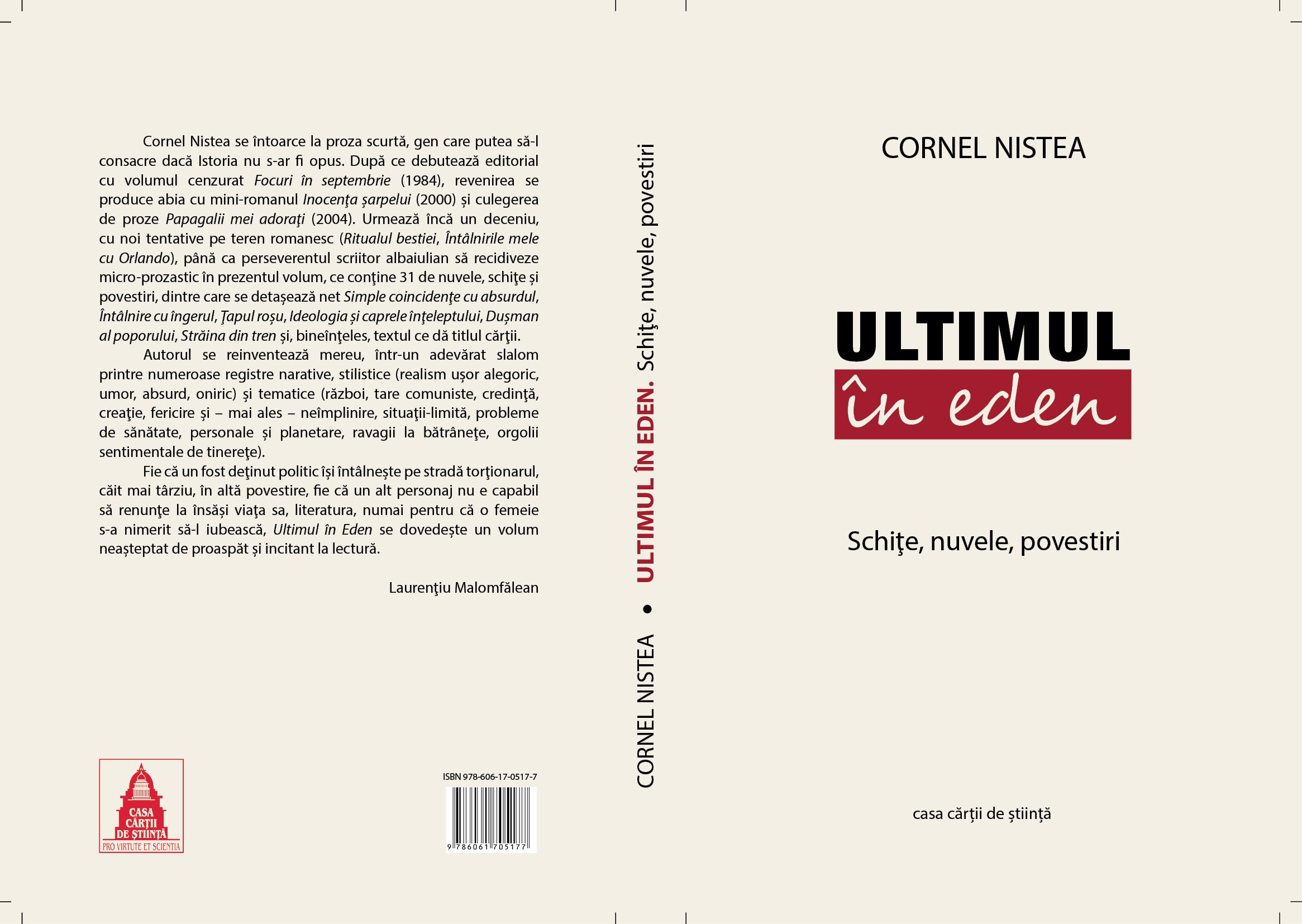 După zece ani de la publicarea volumului de proză scurtă, Papagalii mei adoraţi, (2004), Cornel Nistea revine cu un nou volum de schiţe, nuvele şi povestiri, Ultimul în Eden, apărut recent la Editura Casa Cărţii de Ştiinţă din Cluj-Napoca.